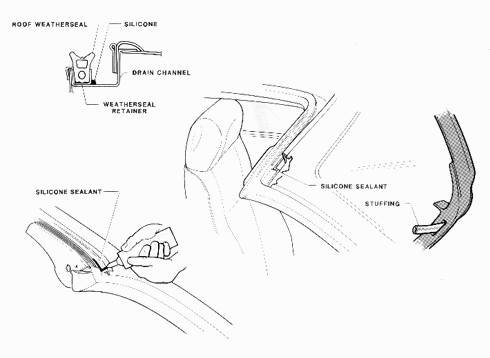 Weatherseals incorporate breather holes which are located on the back side of the weatherseal which fit into the weatherseal retainers. Use these breather holes to build out the weatherseal from the inside. This achieves a greater weatherseal compression. The holes are located at the upper and lower "A" & "B" pillar roof weatherseal. Also at the end of each t-roof glass panel rail weatherseal. These breather holes can assist you in stopping wind noise and water leaks at the lower "A" & "B" pillars. Use a stuffing of the same quality as the weatherseal. Caution: Too much close cell foam stuff could cause problems, such as push out on the door glass at the top, leaving gaps at the portion of the weatherseals to the door glass. Also higher door closing effort could occur.